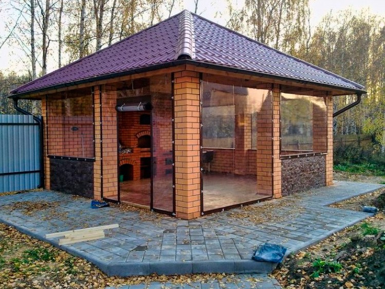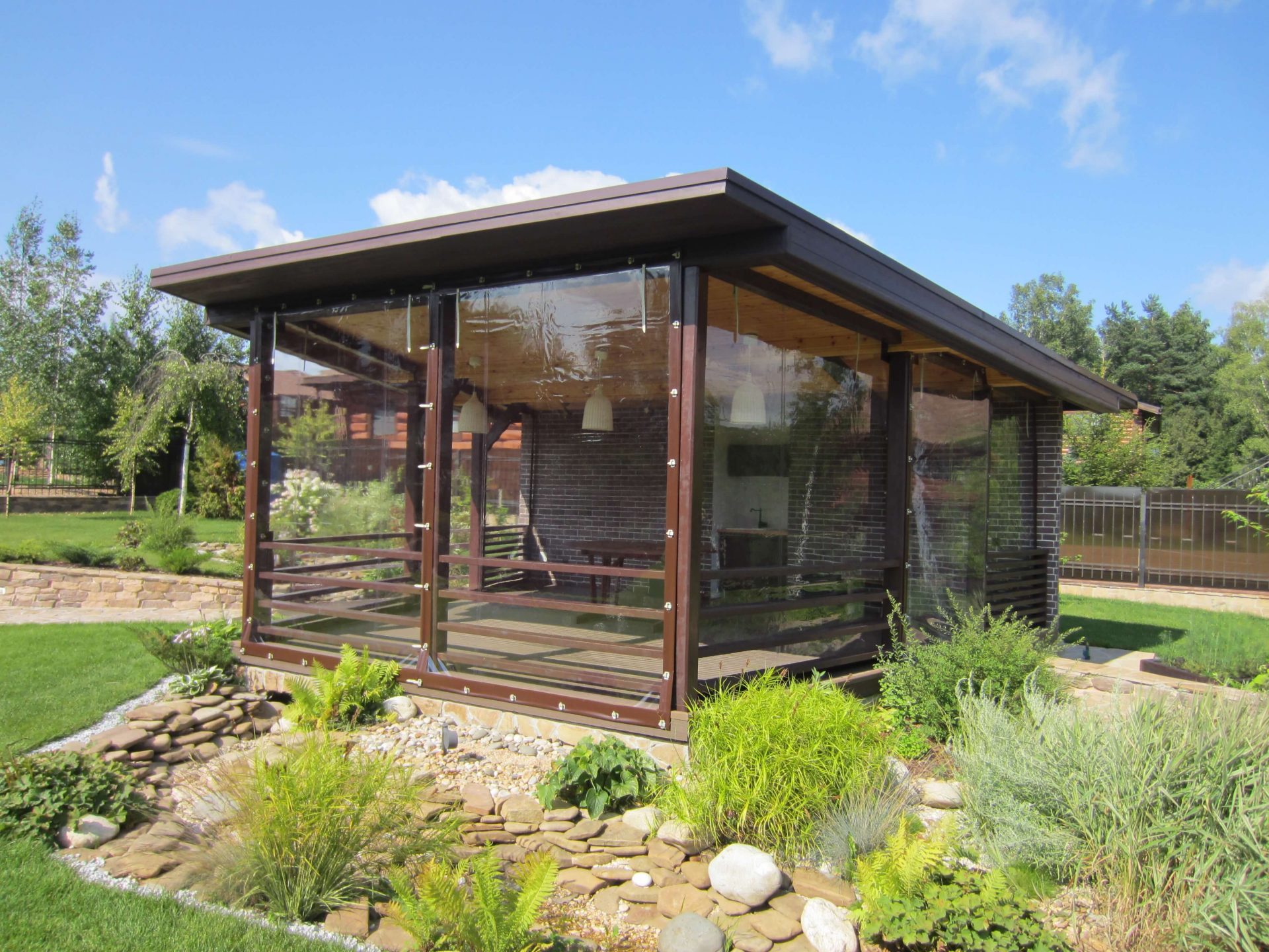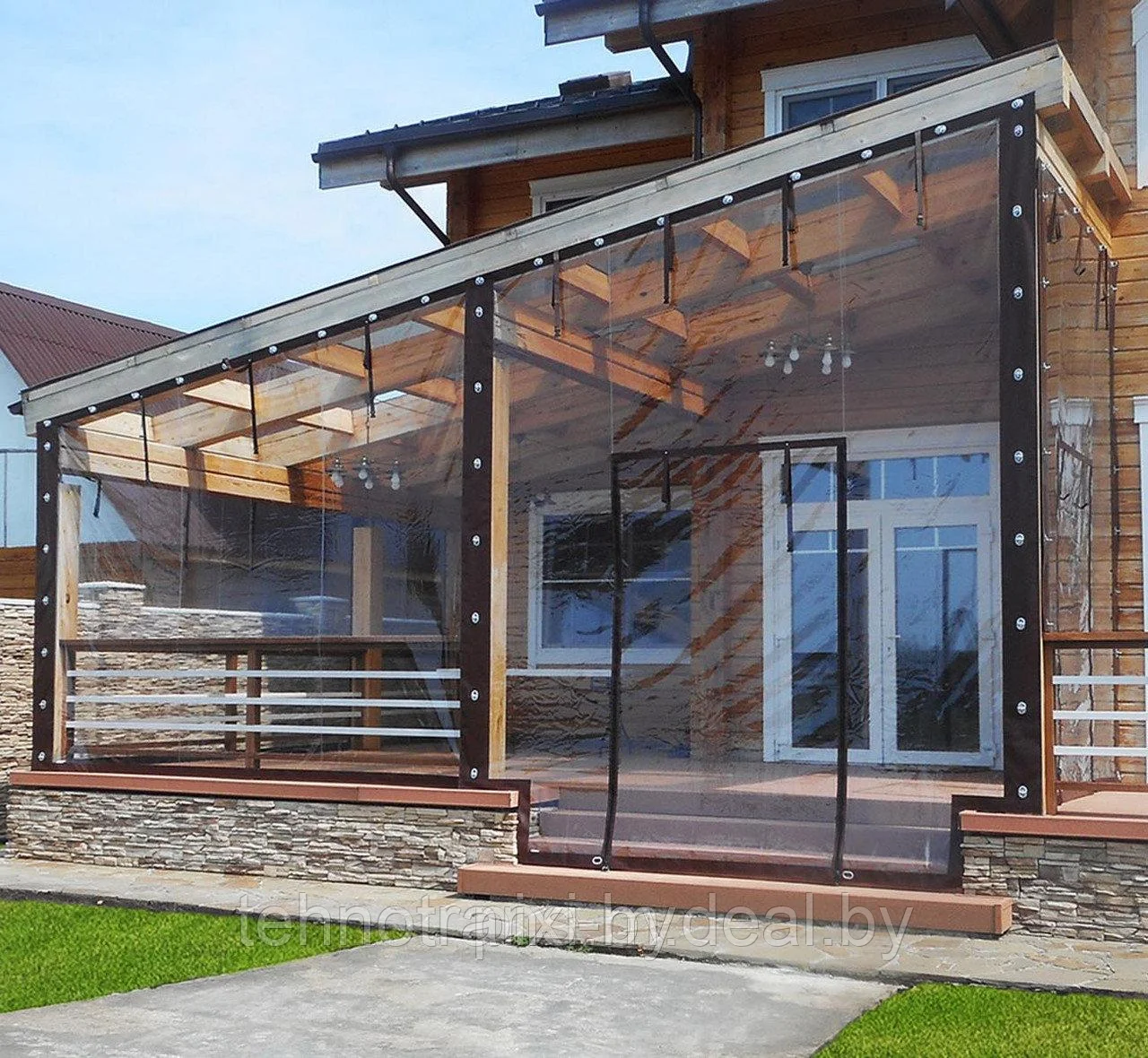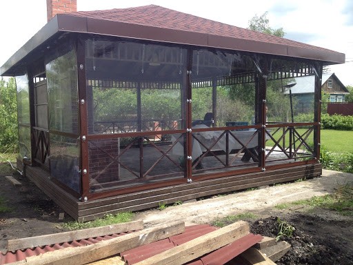 Прозрачные шторы для летней веранды. Гости теперь сидят до поздней осени, а раньше в сентябре уже закрывались. Не хлопают на ветру, легко моются.
